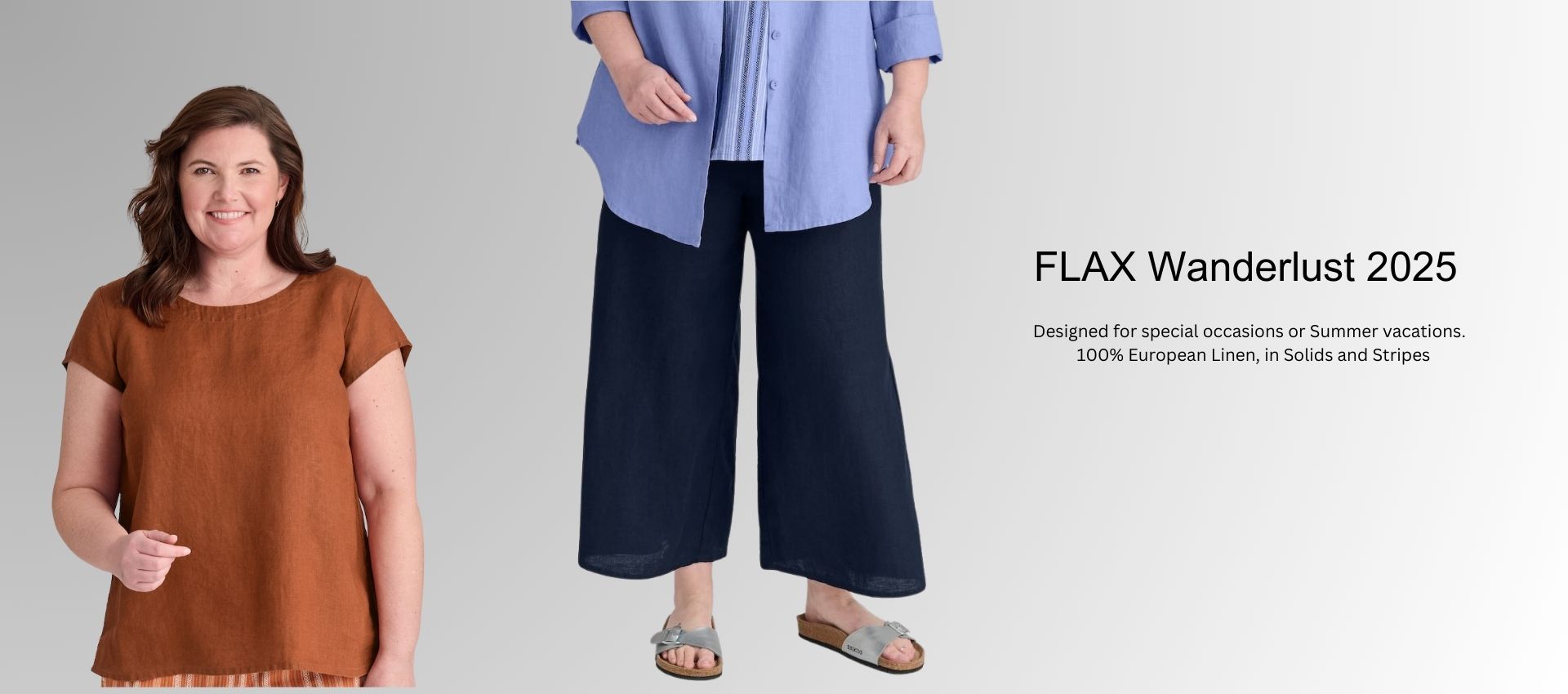 Featuring 100% European Linen from FLAX (sizes 6-26) and Eileen Fisher (XXS - XL).