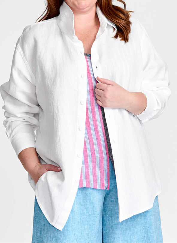 A classic button-down linen blouse, with a shirt collar, long sleeves, featuring beautiful corozo buttons on the front closure and cuffs. Finished with a shirttail hem and flattering pleat on the back. Wether you wear it buttoned up as a blouse or leave it open as a lightweight jacket or cover up, you will be cozy and comfy,