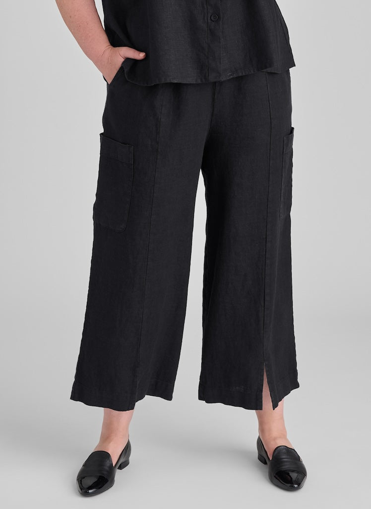 A stylish ankle-length linen pant with a full elastic waist, 2 side seam pockets, and 2 large side cargo pockets. Full and roomy pant legs feature center seam detail and front hem slits, for the perfect finishing touch!